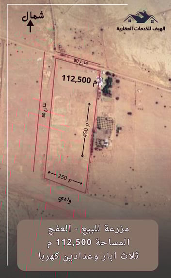 للبيع أرض زراعية مميزة في منطقة العفج، بمساحة إجمالية قدرها 112,500 متر مربع.